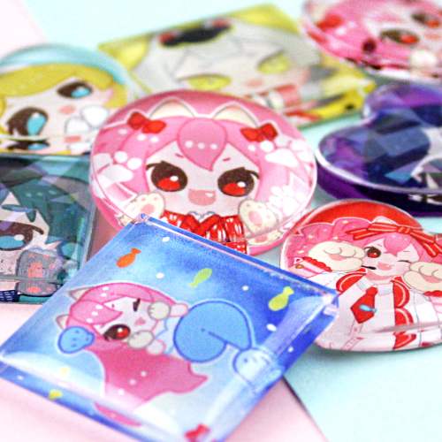 印刷後、アクリルのオモテ面にポッティングシールを貼付し(表面加工)、厚みのあるぷっくりつやっとした状態に仕上げます。ウラ面には両面シールを貼付し、シールとして使用できる状態に仕上げます。