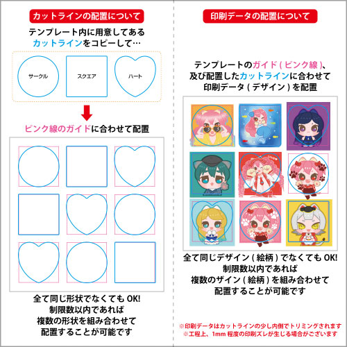 ●印刷データ(デザイン)はカットライン(仕上がりサイズ)の少し内側でトリミングされます。カットラインギリギリに配置された印刷データ(デザイン)は印刷されない可能性がございますのでご注意ください。